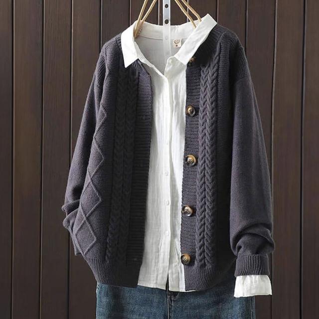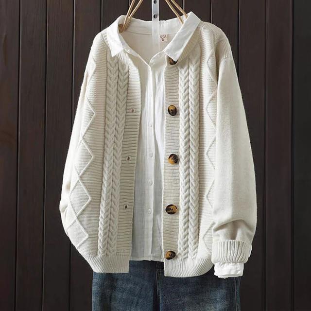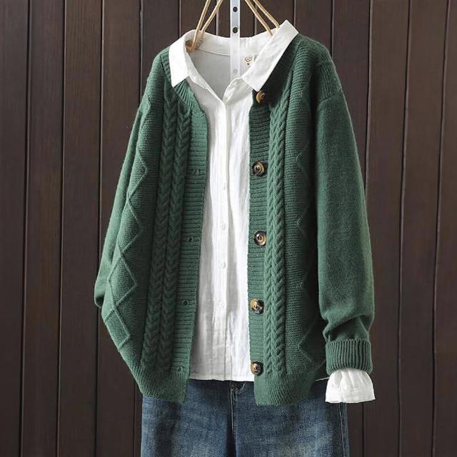ROCU 若初文藝復古精緻麻花純色休閒寬鬆百搭圓領長袖針織毛衣外套女外套-共5色-38942(F可選)