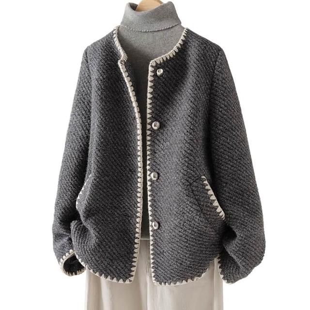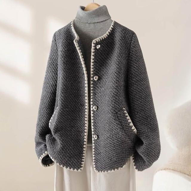 ROCU 若初日系小香風撞色縫線粗花針織毛呢圓領長袖短款大衣外套女外套-深灰色-38977(M-2XL可選)