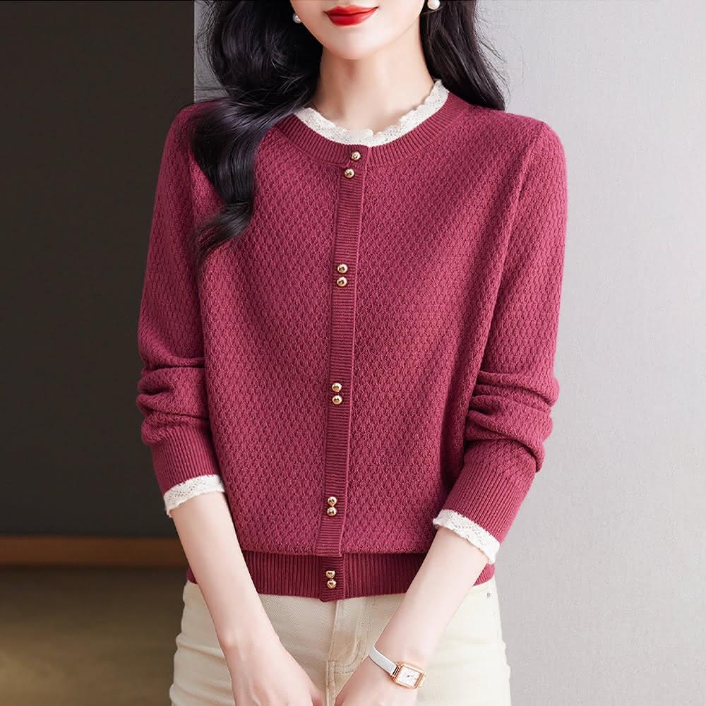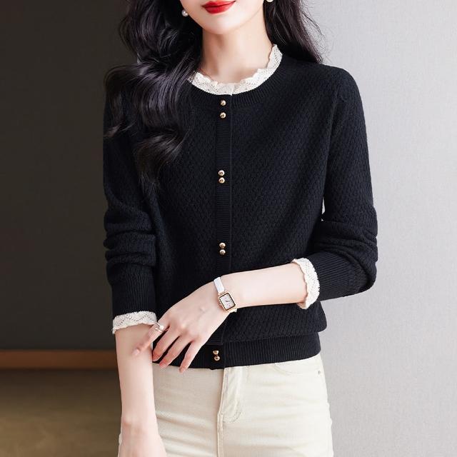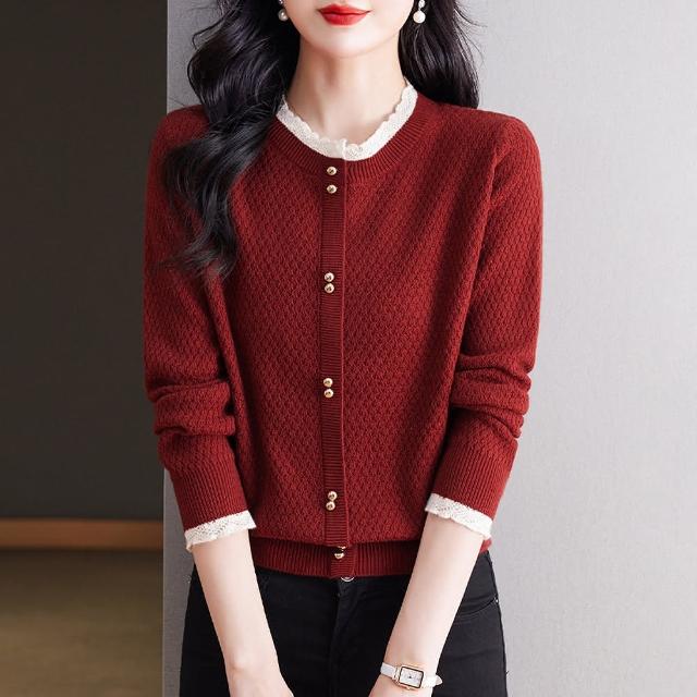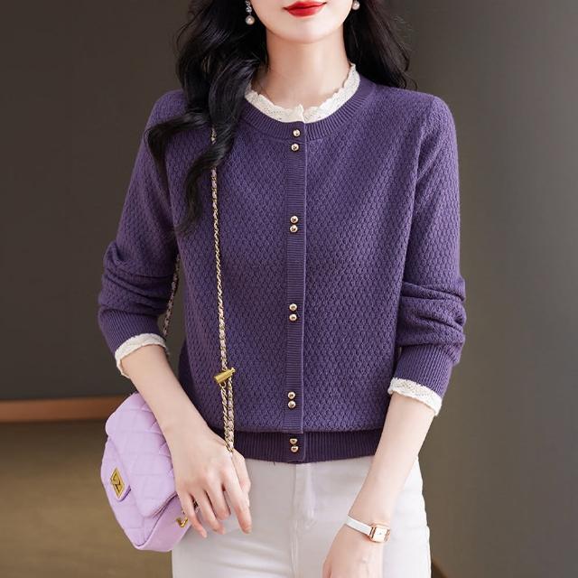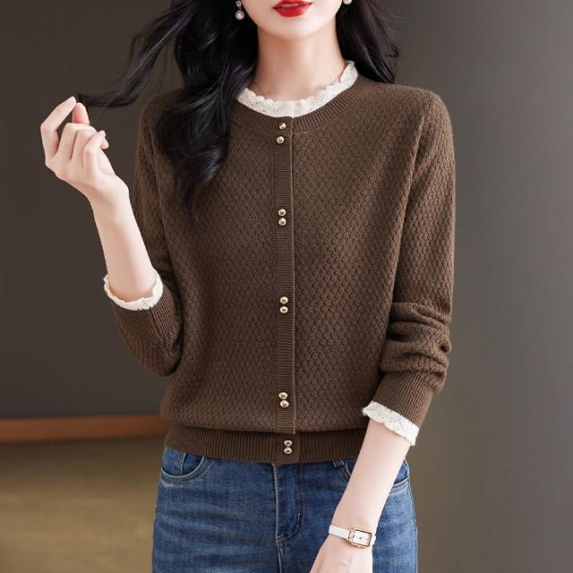 ROCU 若初純色休閒蕾絲拼接顯瘦百搭圓領長袖針織衫毛衣外套女外套-共5色-39015(F可選)