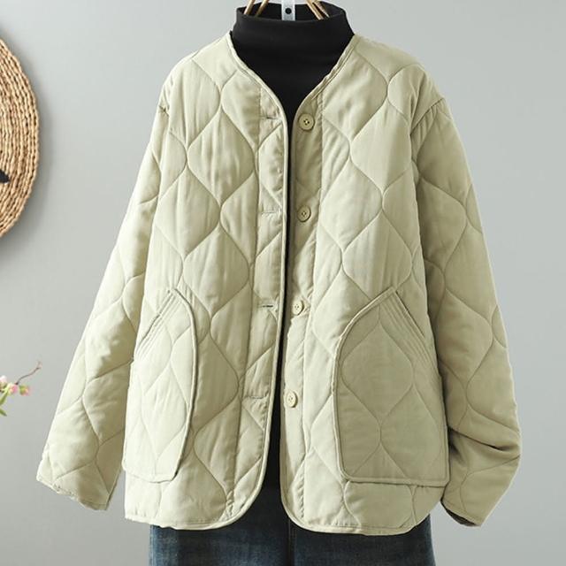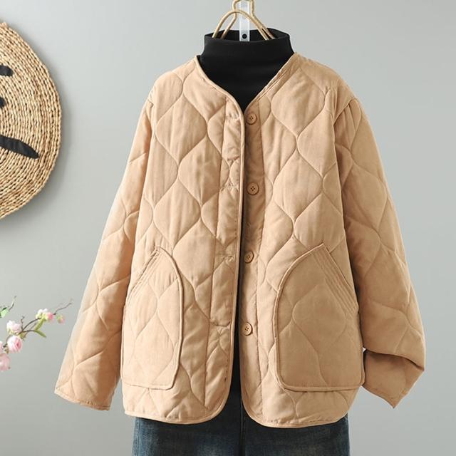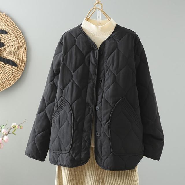 ROCU 若初復古菱形格紋圓領長袖排釦棒球服鋪棉外套女外套-共3色-39064(M-2XL可選)