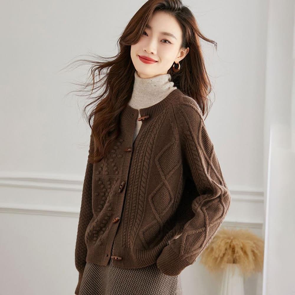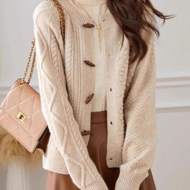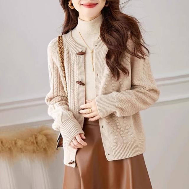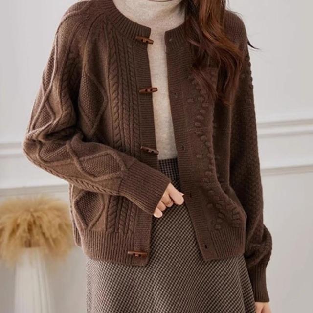 ROCU 若初日系麻花紋理圓領落肩袖長袖單排牛角扣毛衣針織開衫外套女外套-共2色-39223(F可選)