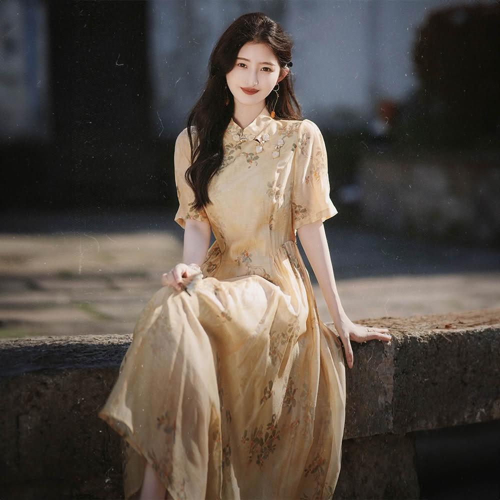 ROCU 若初新中式立領五分短袖改良式旗袍連衣裙連身洋裝-米杏色-33997(M-XL可選)