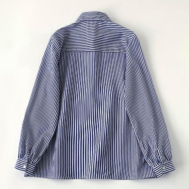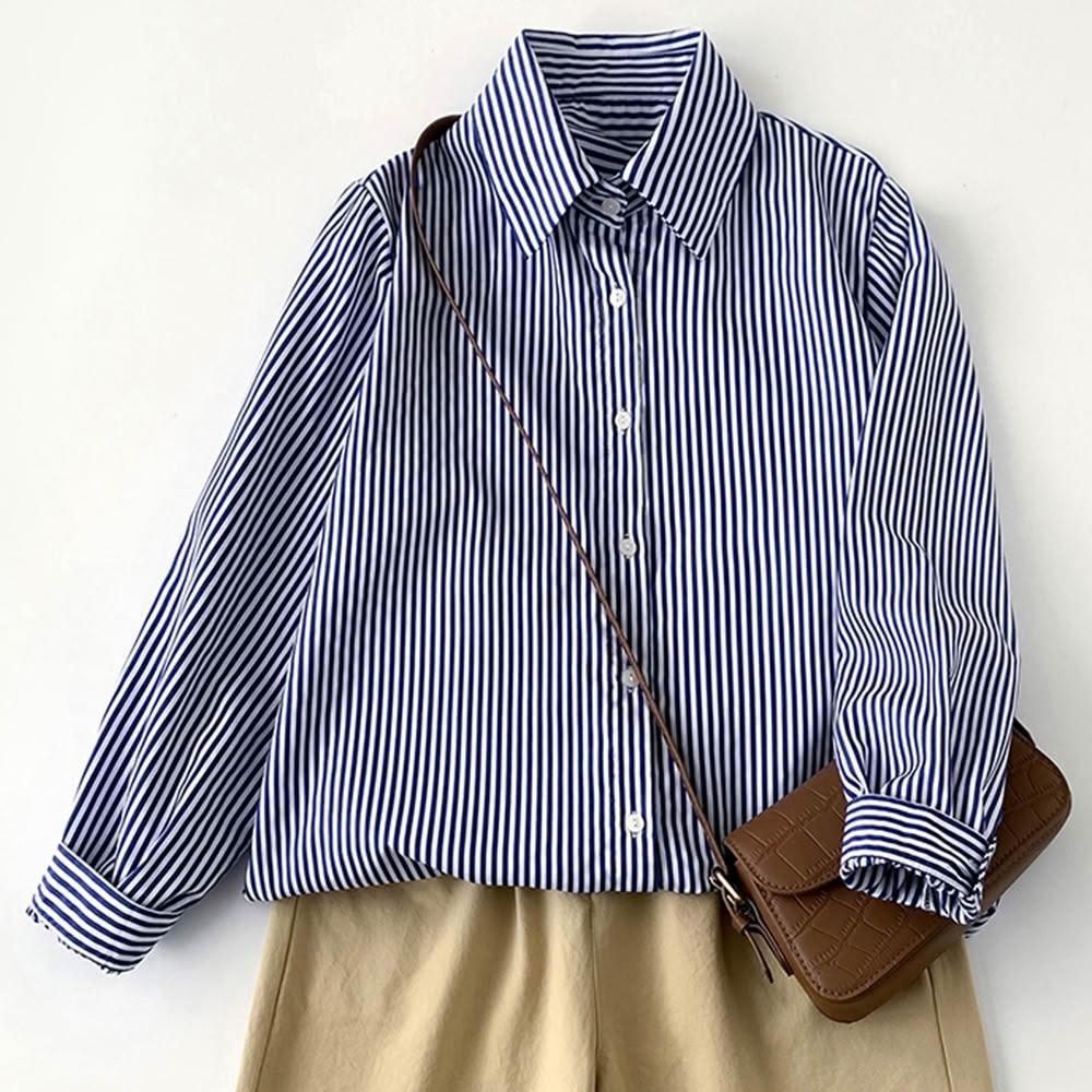 ROCU 若初棉麻通勤藍白條紋單排釦襯衫長袖上衣女上衣-藍色-10540(M-2XL可選)