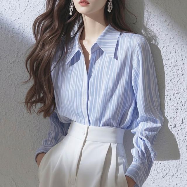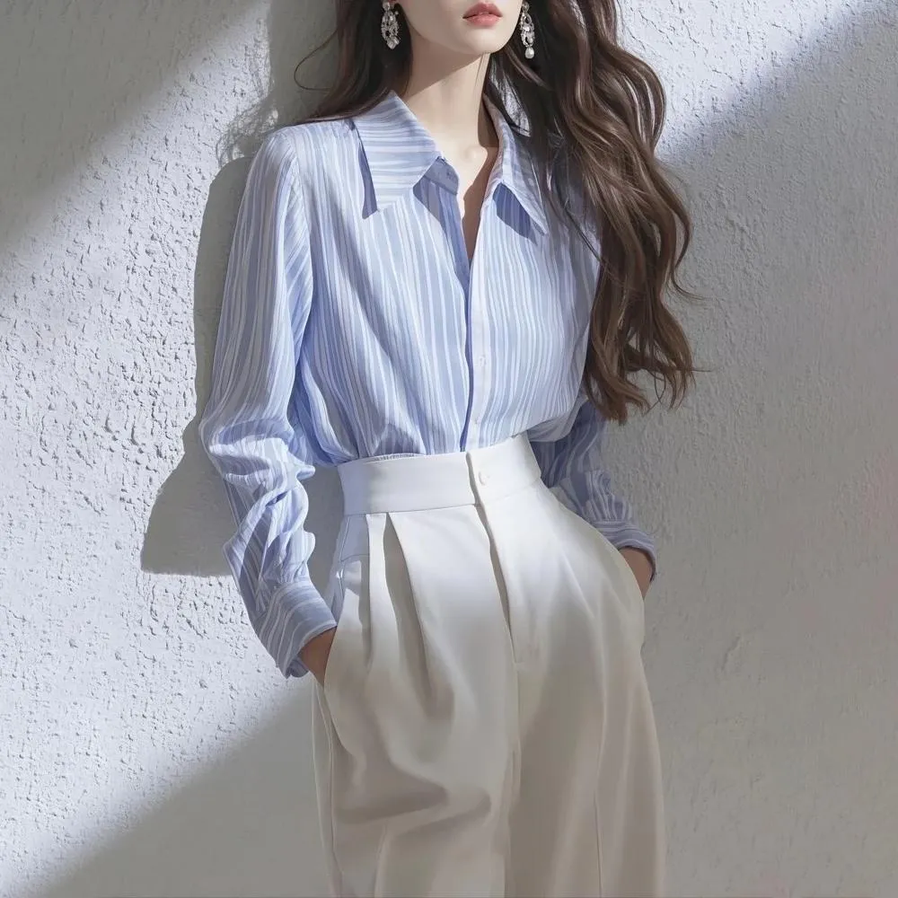 ROCU 若初翻領條紋長袖襯衫女上衣+純色高腰休閒褲寬褲西裝長褲套裝-藍衣白褲-10690(M-XL可選)