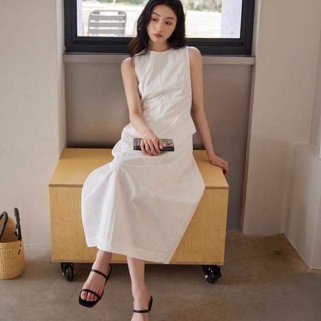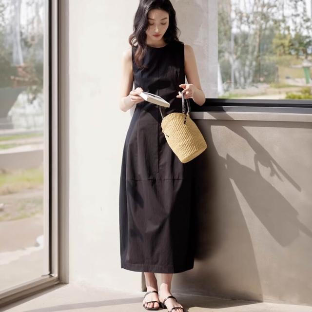 ROCU 若初法式純色圓領高腰口袋無袖連衣裙連身洋裝長裙-共2色-11469(M-XL可選)