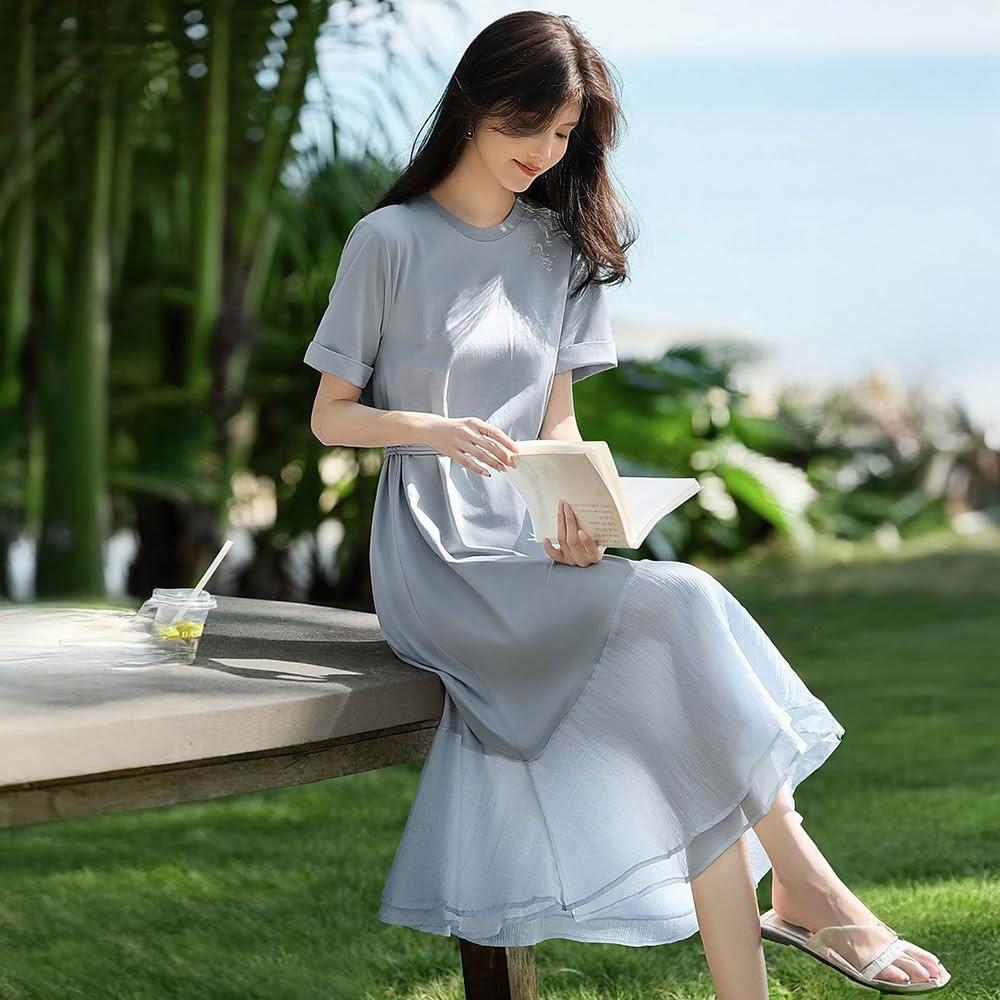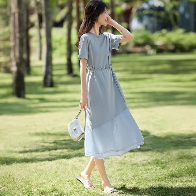 ROCU 若初簡約純色針織拼接輕紗圓領短袖連衣裙連身洋裝長洋裝-淺灰藍-11631(M-2XL可選)