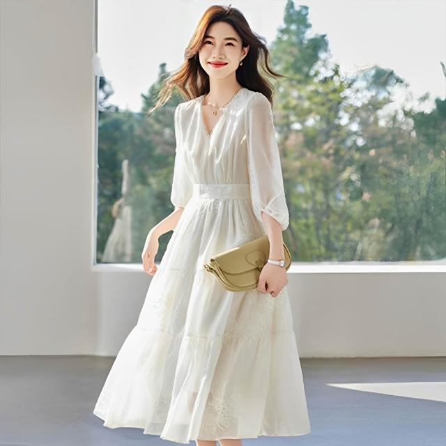 ROCU 若初法式氣質刺繡雪紡V領透膚長袖蛋糕裙連衣裙連身洋裝長洋裝-白色-11659(M-2XL可選)