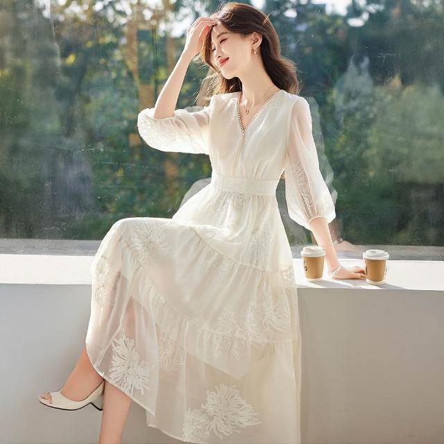 ROCU 若初法式氣質刺繡雪紡V領透膚長袖蛋糕裙連衣裙連身洋裝長洋裝-白色-11659(M-2XL可選)