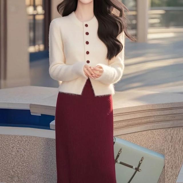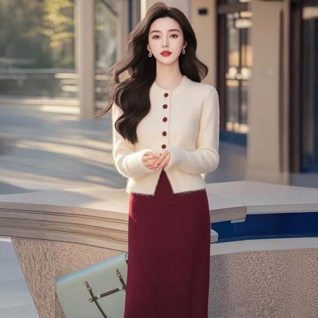 ROCU 若初小香風圓領長袖單排扣毛衣上衣女上衣+純色修身半身裙套裝-杏衣紅裙-15124(M-XL可選)