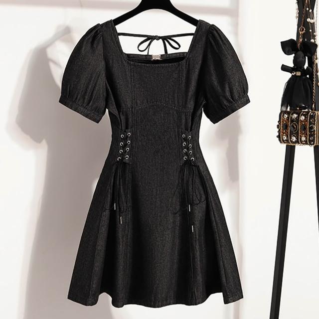 ROCU 若初法式復古修身綁帶牛仔連身短裙中長連衣裙連身洋裝-共2色-15316(M-4XL可選)