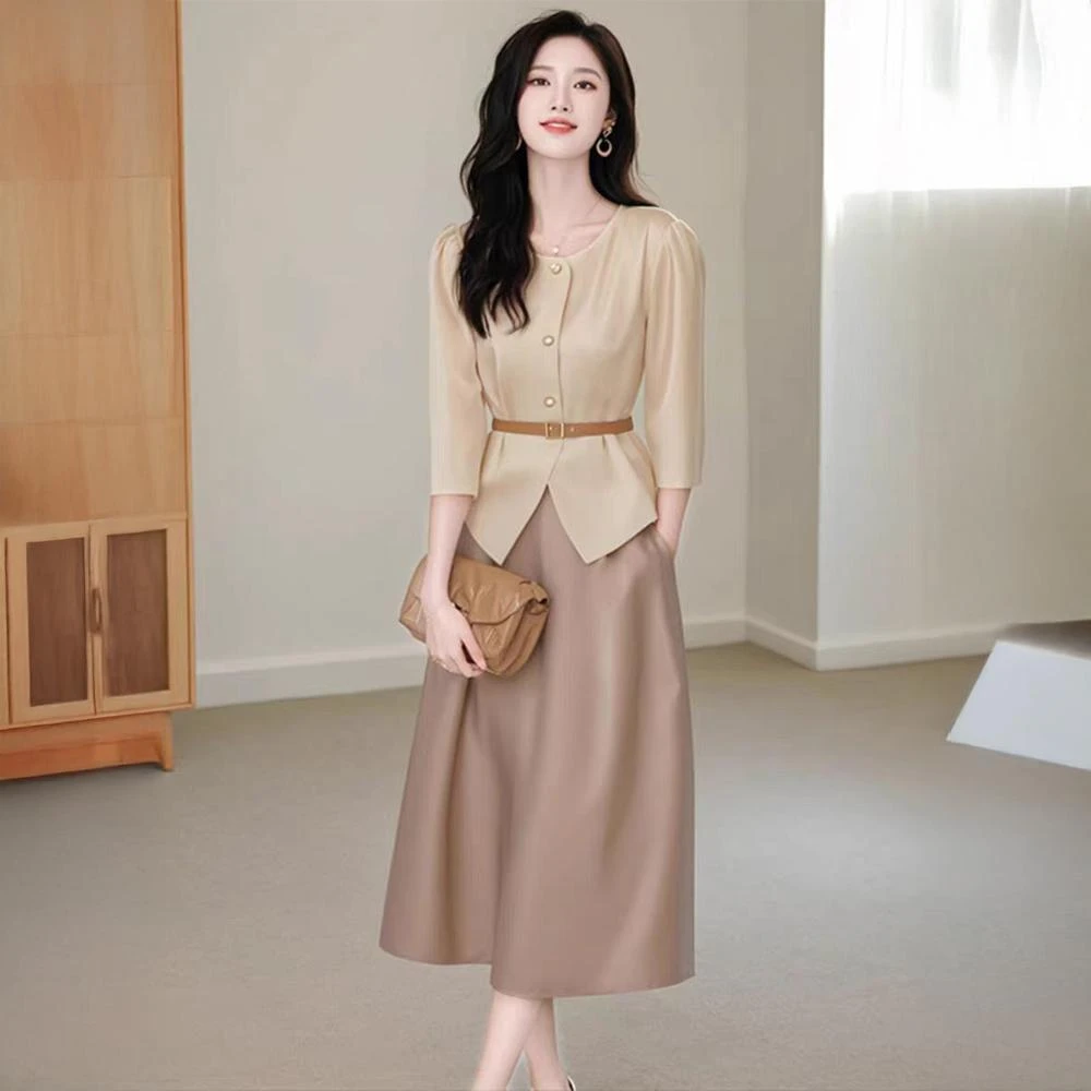 ROCU 若初純色圓領單排釦長袖襯衫上衣女上衣+簡約修身半身裙套裝-杏衣棕裙-10929(M-2XL可選)