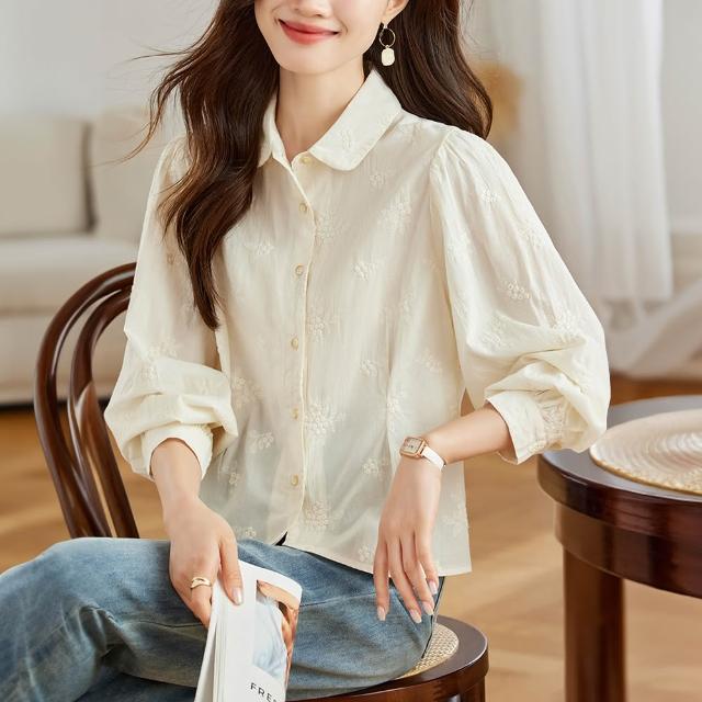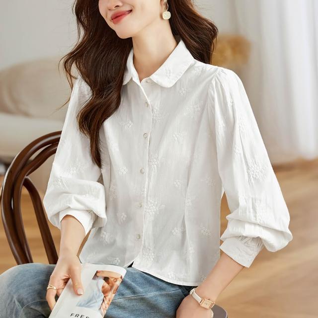 ROCU 若初輕熟風中式簡約繡花修身翻領長袖純棉襯衫上衣女上衣-共2色-11310(M-2XL可選)