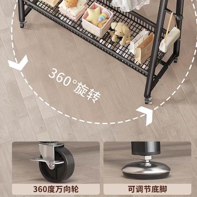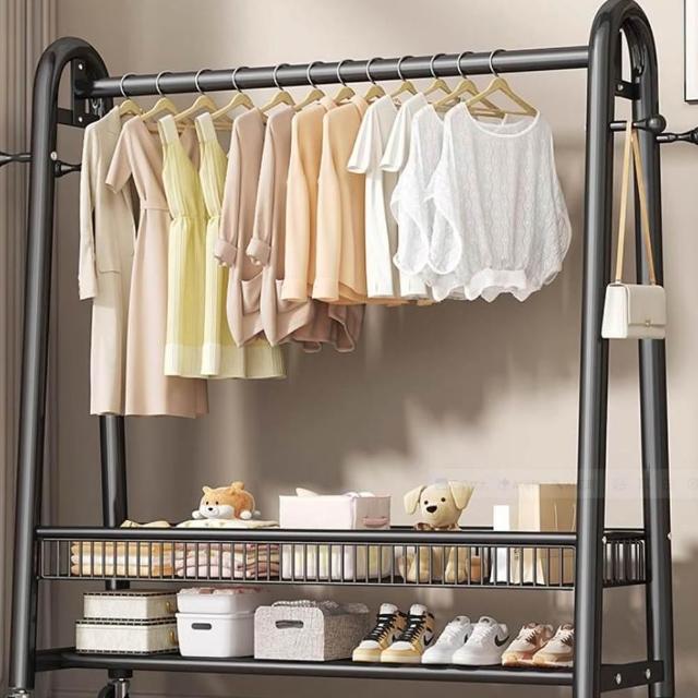 妙立 落地晾衣架 衣帽架 衣櫥 曬衣架 置物架 三角衣帽間 雙層網籃 加粗碳鋼框架 側面4掛鉤 多樣收納 滑輪款