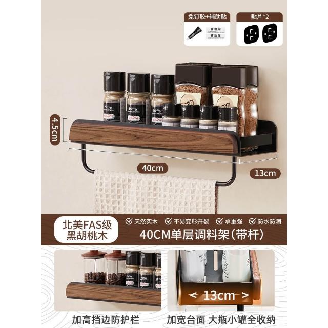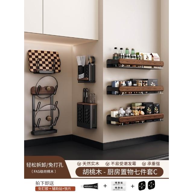 廚房置物架胡桃木調味料壁掛式免打孔牆上多層刀架筷勺子收納架子