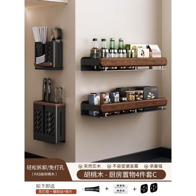 廚房置物架胡桃木調味料壁掛式免打孔牆上多層刀架筷勺子收納架子