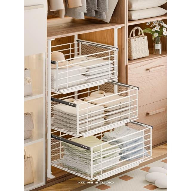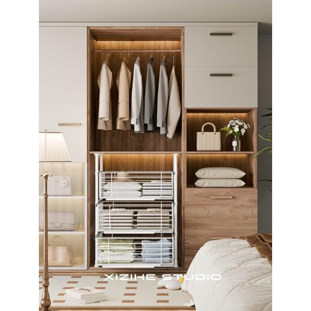 衣櫃拉籃抽屜式免打孔分層推拉軌道收納抽拉褲架伸縮多層改造內置
