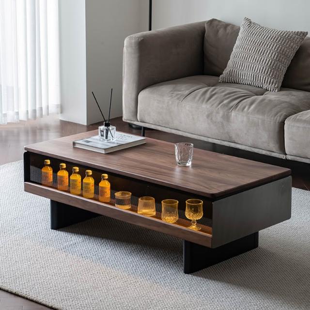 北美黑胡桃木實木岩板茶几小戶型茶几燈帶燈現代簡約黑色北臥茶臺