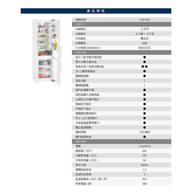 LIEBHERR 利勃德國利勃 獨立式上下門冰箱-白 (CNP4056) 變頻壓縮機、自動除霜、能源3級
