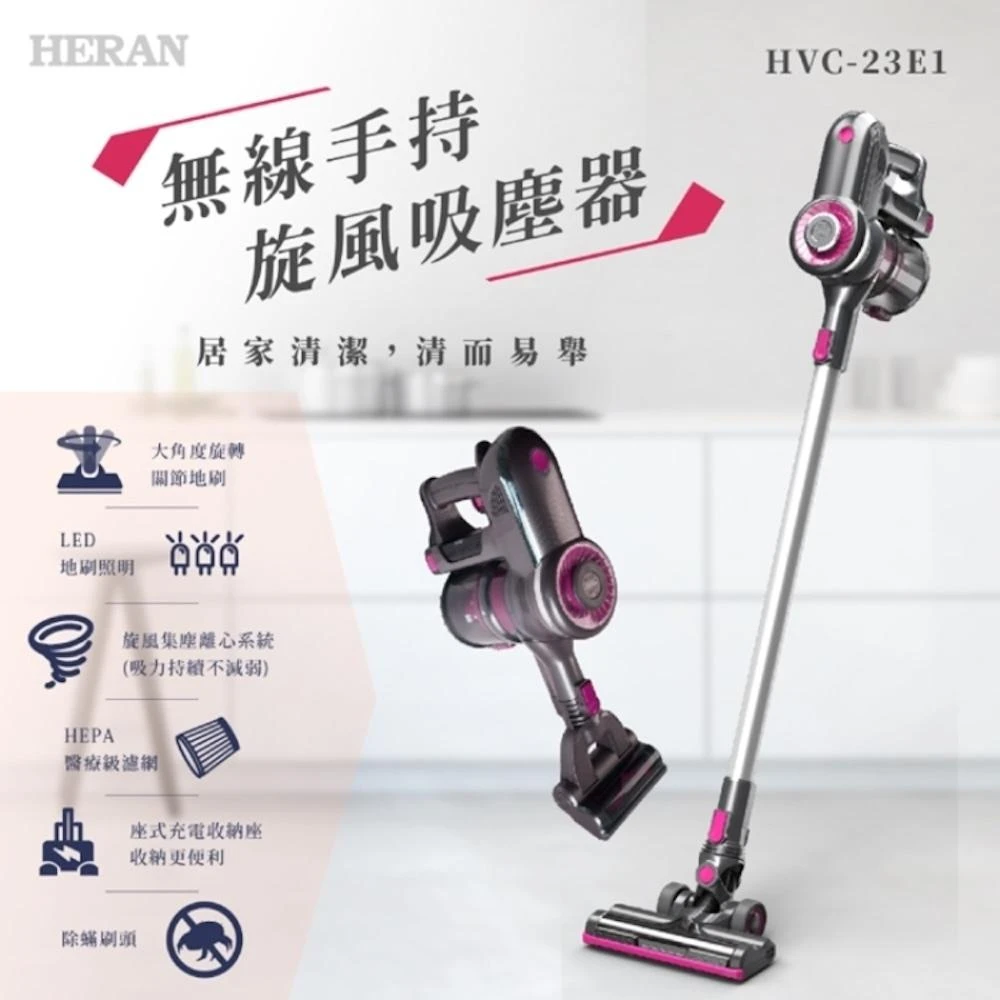 HERAN 禾聯無線手持旋風吸塵器+除螨刷頭(HVC-23E1)附充電收納座~醫療級HEPA濾網/有刷馬達
