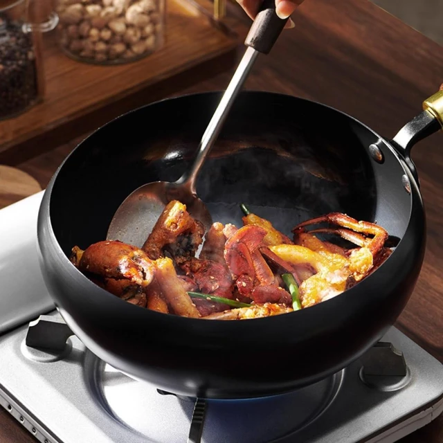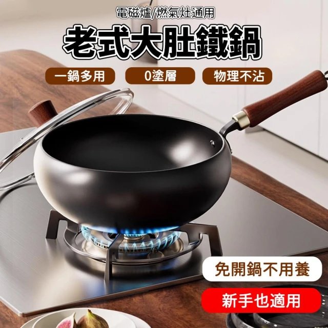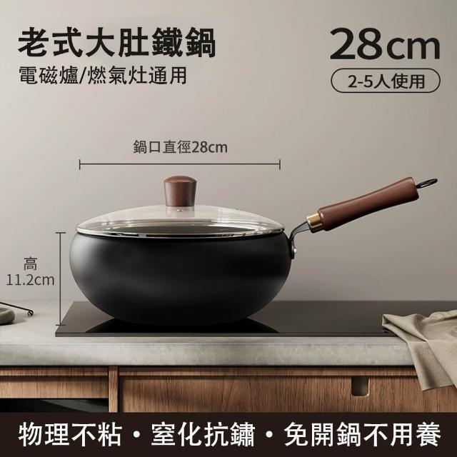 老式大肚鐵鍋28cm 炒鍋 無塗層 免開鍋 加深鍋體 爐竈通用 (帶玻璃蓋)
