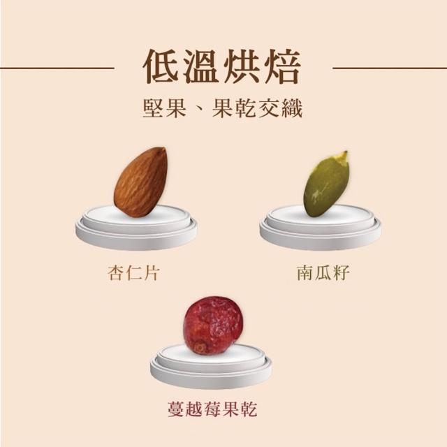 - 搭配蔓越莓乾與南瓜籽及杏仁片