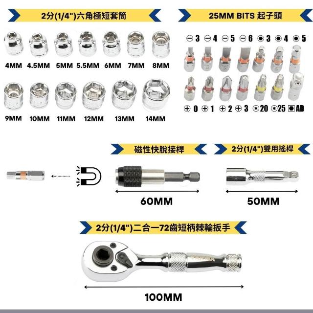 30件組雙頭迷你棘輪套筒工具組|1/4"(兩分) 短柄棘輪扳手|25mm起子頭+六角極短套筒全配|萬用維修工具盒|台灣製