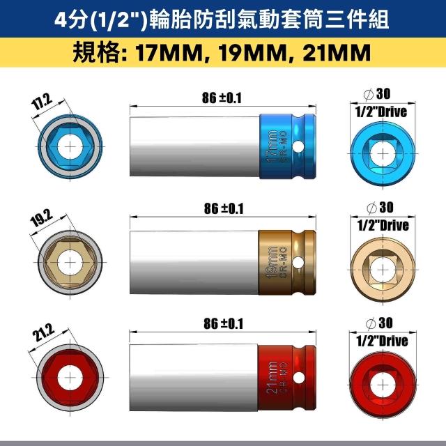 四分輪胎防傷套筒三件組|1/2" (4分) 17mm 19mm 21mm|手動/氣動適用|汽車維修輪胎套筒工具|汽修必備