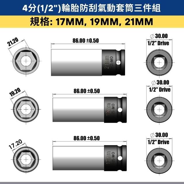 四分輪胎防傷套筒三件組|1/2" (4分) 17mm 19mm 21mm|手動/氣動適用|汽車維修輪胎套筒工具|汽修必備