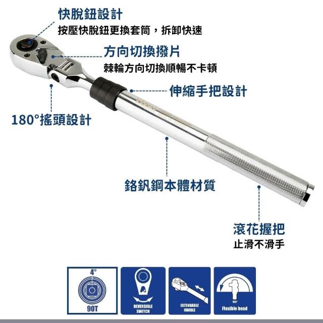 伸縮棘輪扳桿|3/8"、1/2" |90齒快脫|擺頭設計|滾花手把|伸縮棘輪扳手|汽機車維修必備
