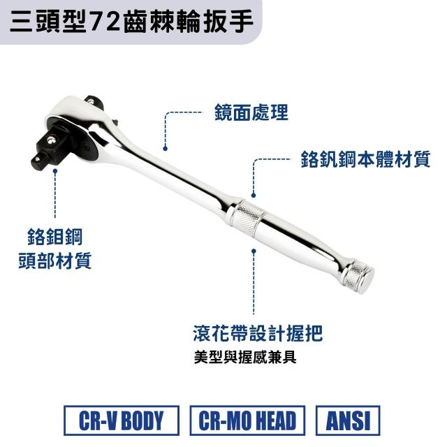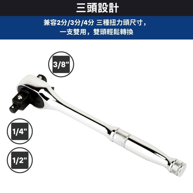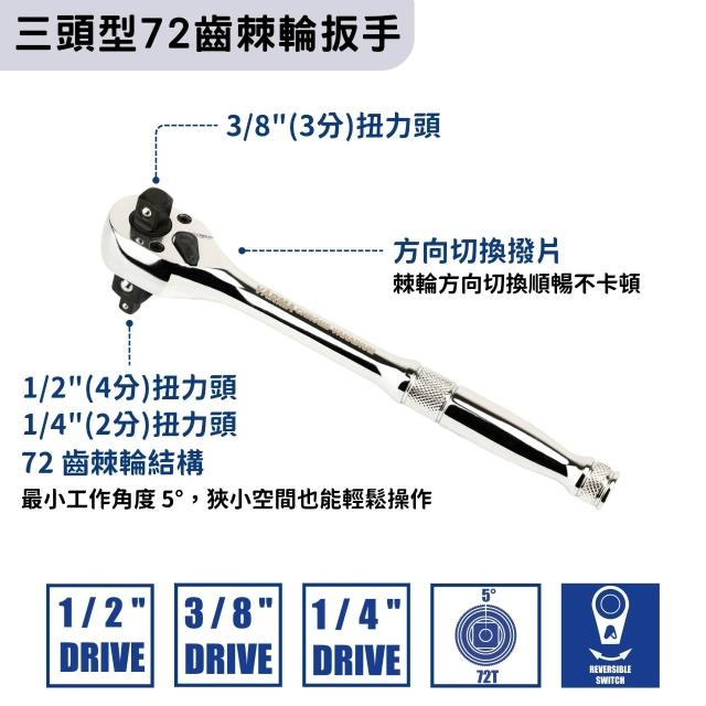 三合一三頭棘輪扳手 1/2" 3/8" 1/4"|72齒快速套筒扳手|3in1 棘輪柄設計|台灣製造|多尺寸切換工具