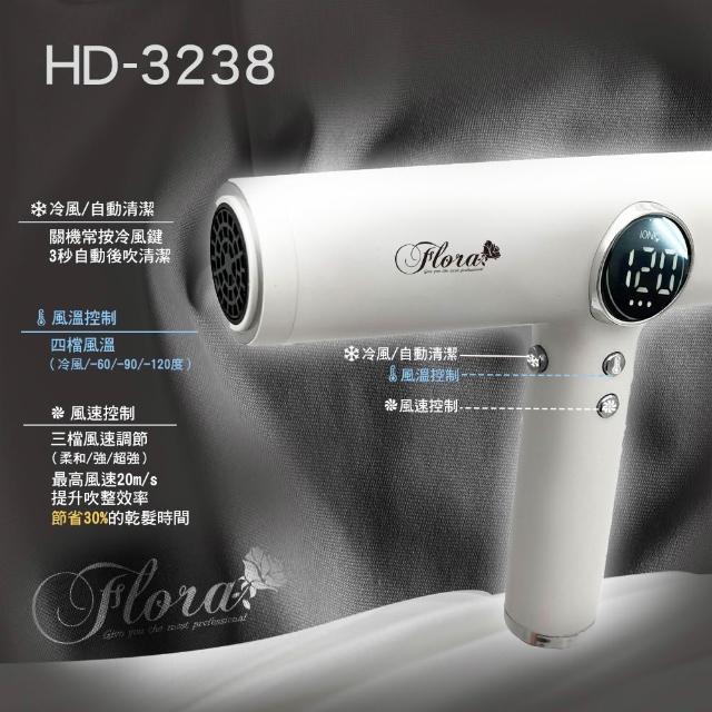 FLORAL 芙蘿菈芙蘿拉 FLORA HD-3238 負離子無刷吹風機 三代沙龍級 速乾護髮 輕量機身 附磁吸捲髮棒 自動清潔 四檔風溫