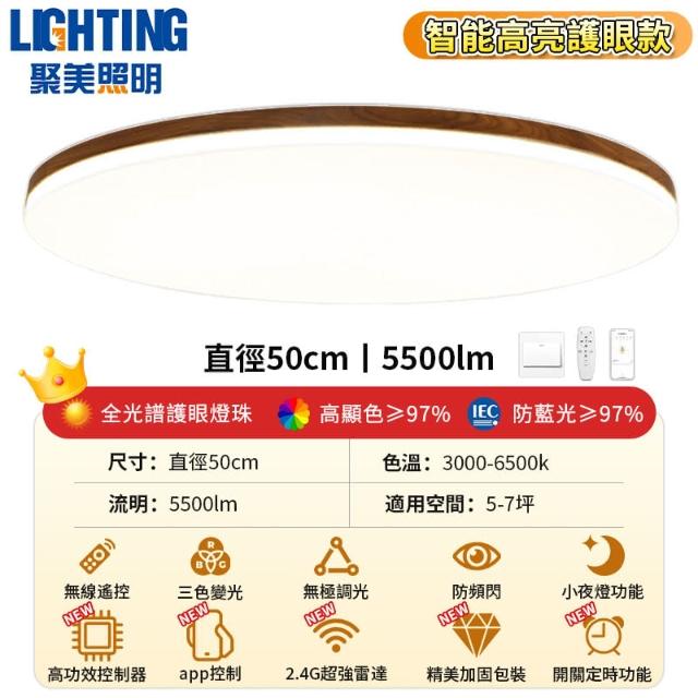 聚美照明led吸頂燈 全光譜護眼客廳燈 臥室燈 app三色無極調光 胡桃木簡約電燈 造型燈 房間燈(台灣品牌 售後保障)