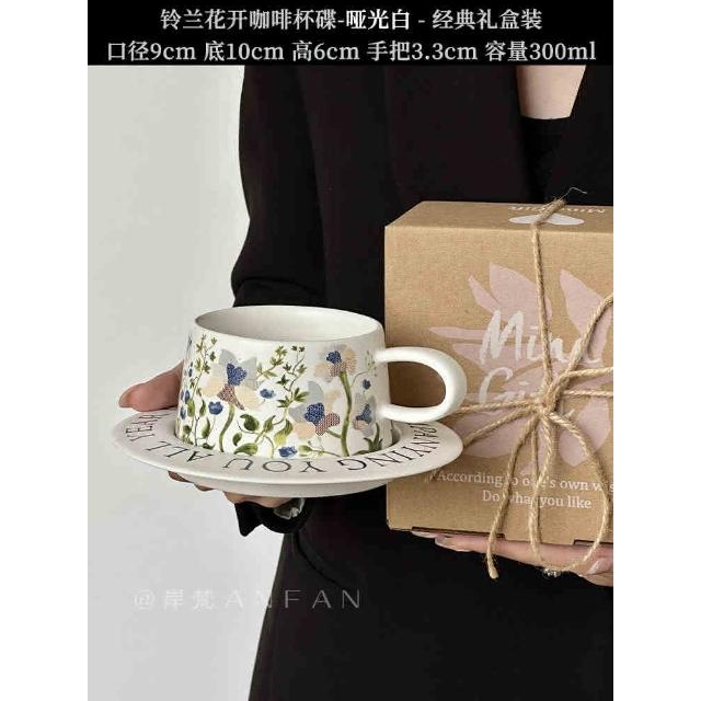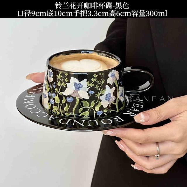 咖啡杯 復古油畫般鈴蘭花開咖啡杯碟 手繪拿鐵杯套裝 原創禮物陶瓷杯