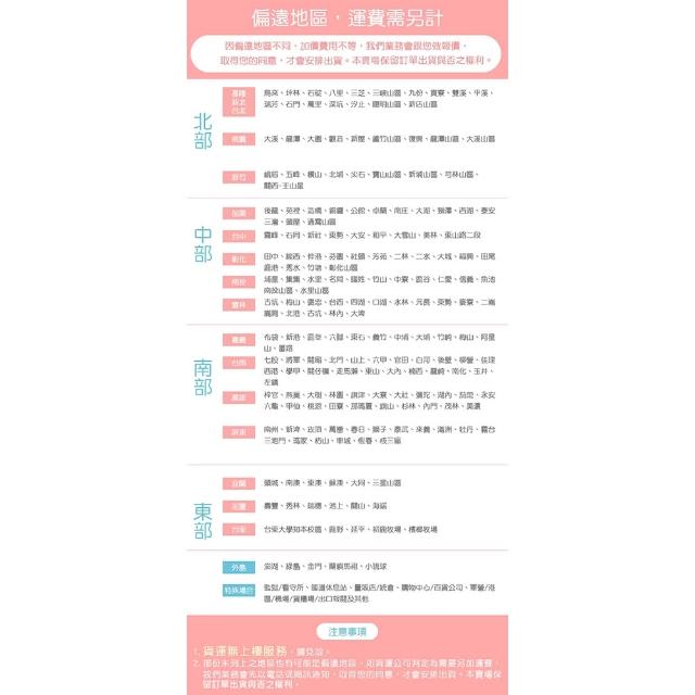 - 針對大型商品(包括:大型家電、家具床墊、健身按摩器材、車類...等),商店將於完成收款確認後,一天內〈不含例假日〉將會有專人與您確認相關配送細節等的聯繫。偏遠地區、樓層費及其它加價費用,皆由商店於約定配送時一併告知,商店將保留出貨與否的權利。