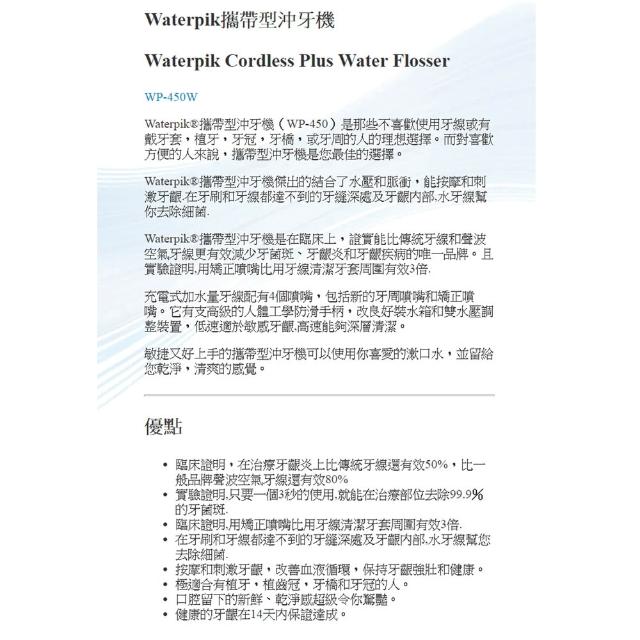 Waterpik攜帶型沖牙機 WP-450W / WP450 (原廠公司貨 一年保固)