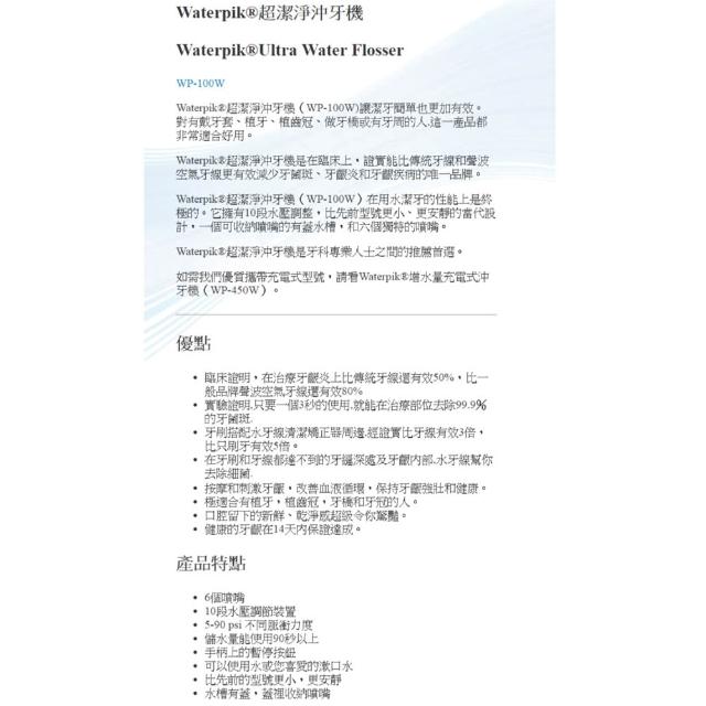 Waterpik超潔淨沖牙機 WP-100W / WP100 (原廠公司貨 二年保固)