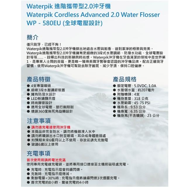 Waterpik美國Waterpik 進階攜帶型2.0沖牙機 WP-580EU