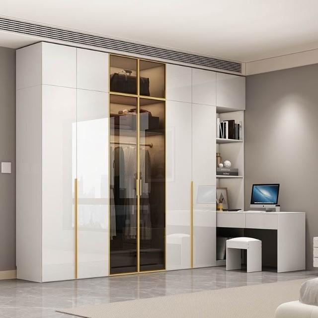 意式極簡衣櫃臥室傢用茶色鋼化玻璃門實木書桌一體大衣櫥轉角組閤