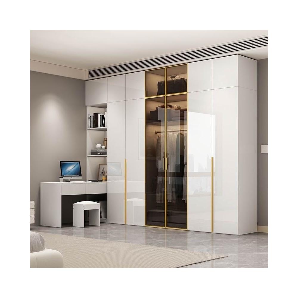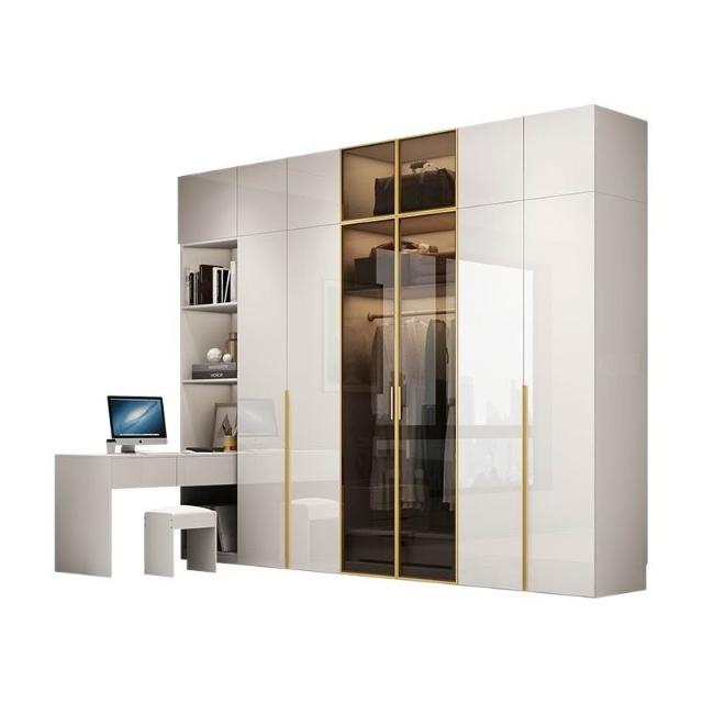 意式極簡衣櫃臥室傢用茶色鋼化玻璃門實木書桌一體大衣櫥轉角組閤