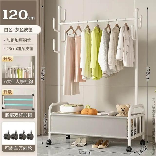 家用落地衣架带筐带轮可移动卧室挂衣架室内置物晾衣架收纳衣帽架