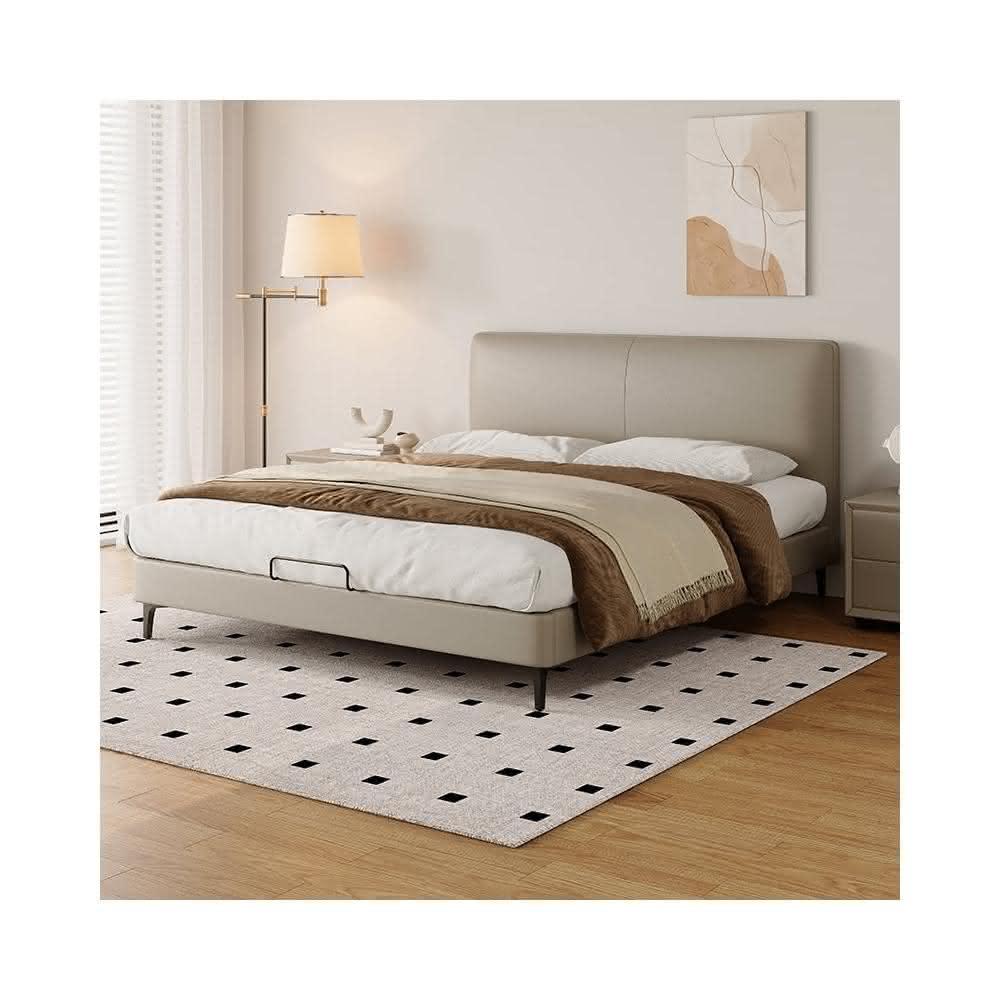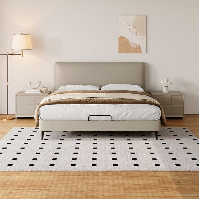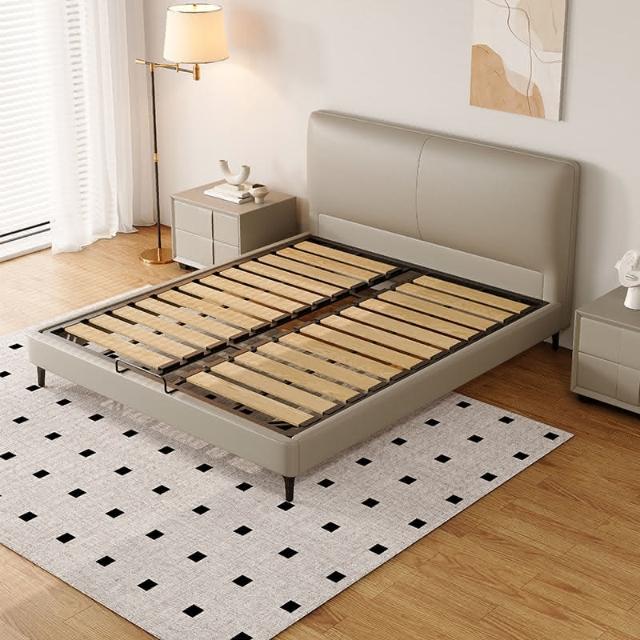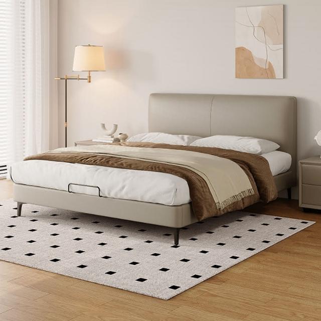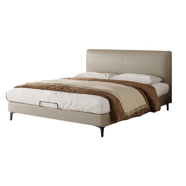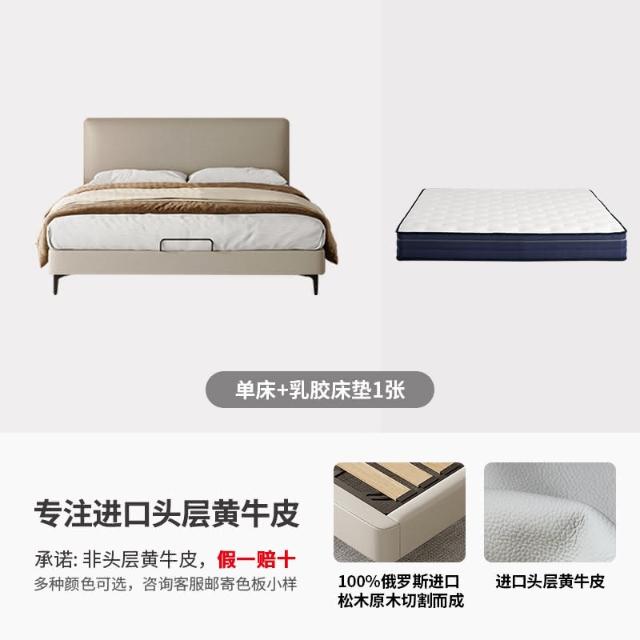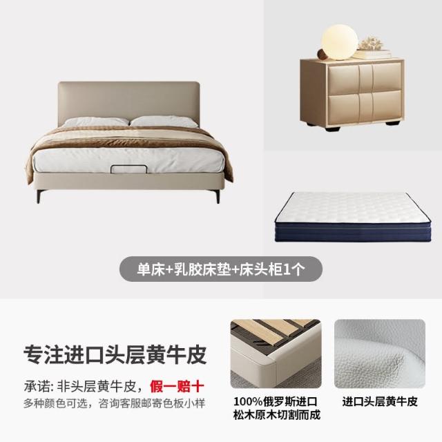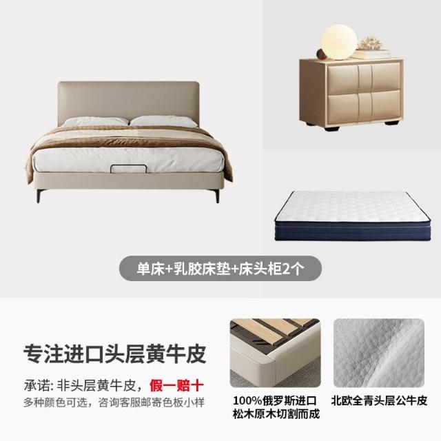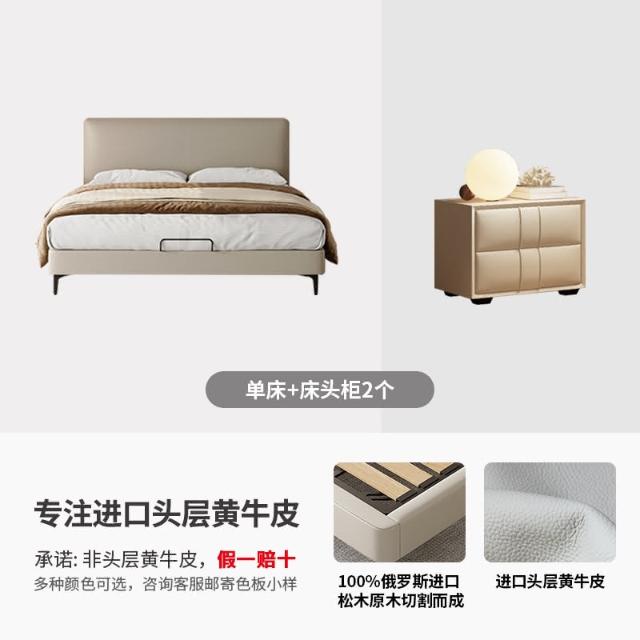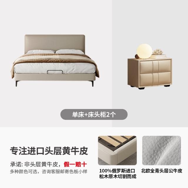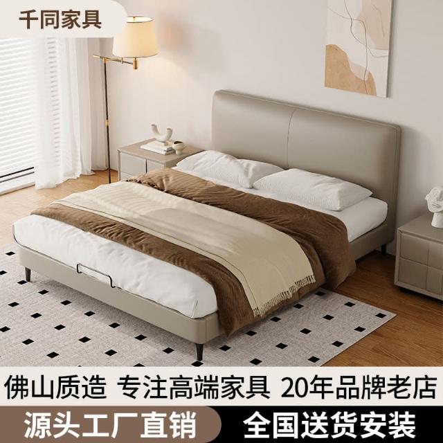 双人现代简约头层牛皮床软包齐边薄床头床主卧极简风落地床新婚床