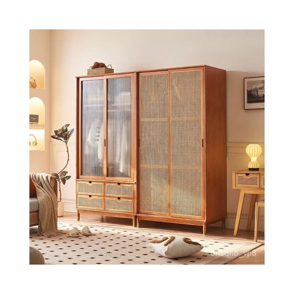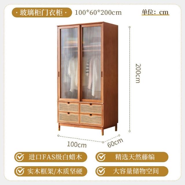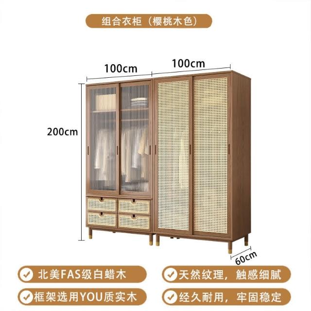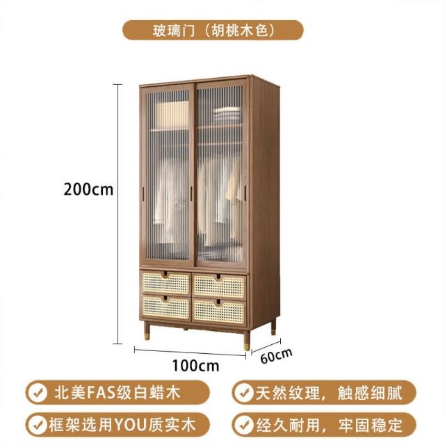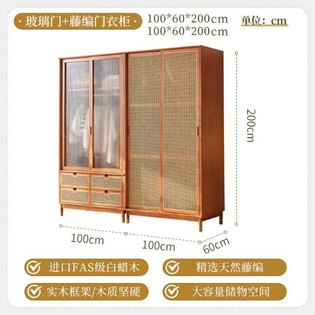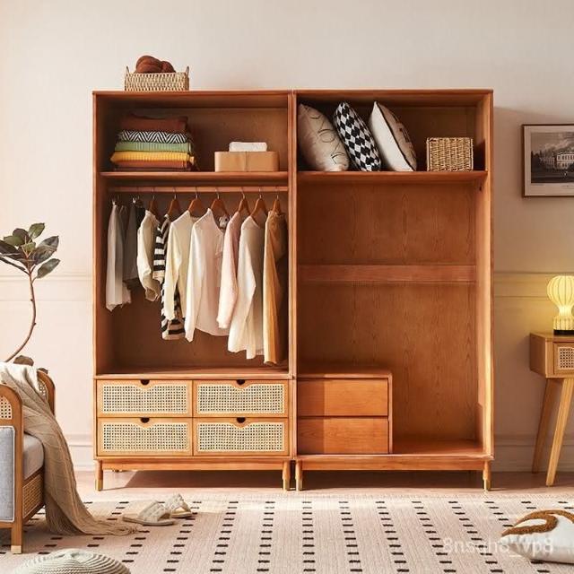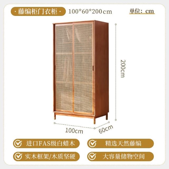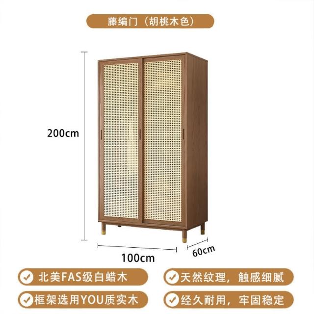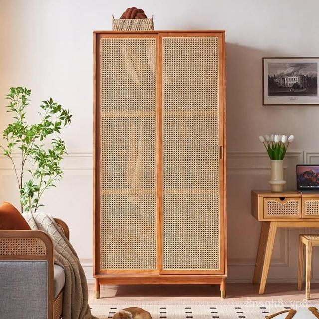 廠傢直發 免運到府 侘寂風實木雙門衣櫃臥室收納儲物櫃傢用推拉門藤編衣櫥簡約小戶型