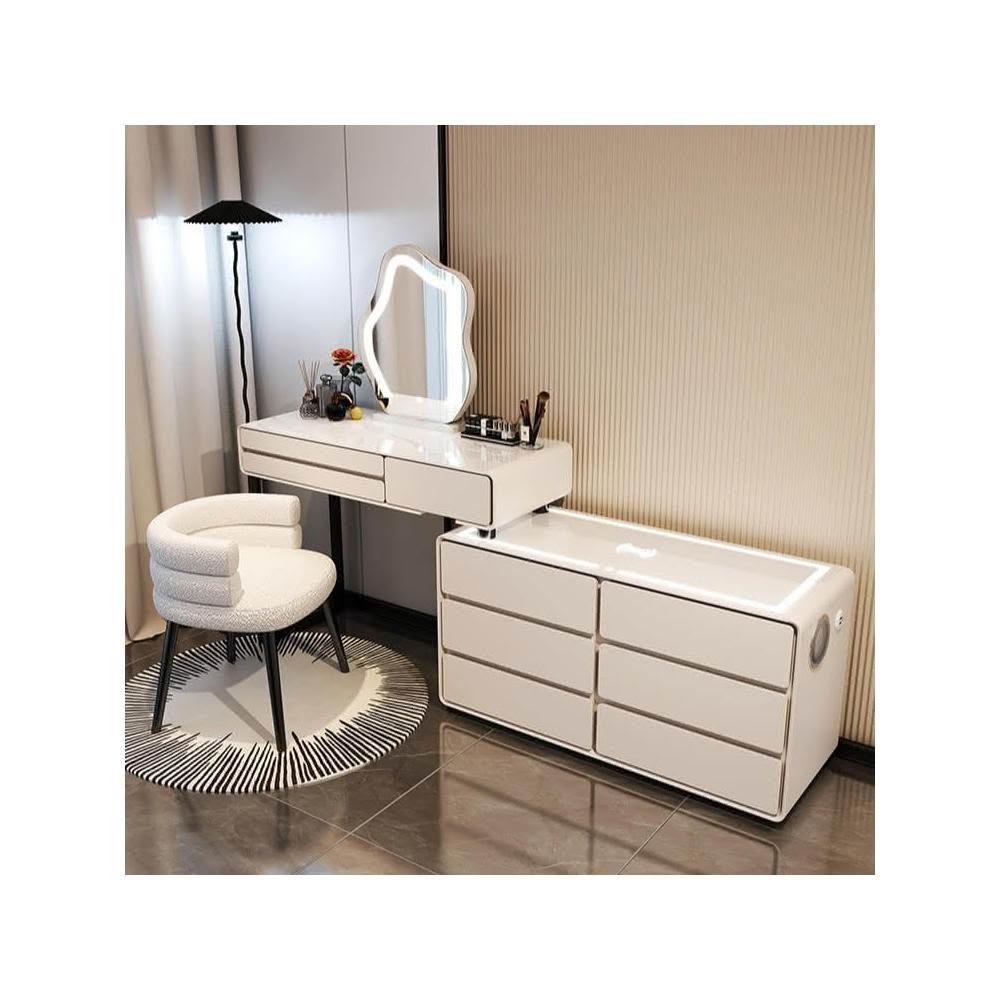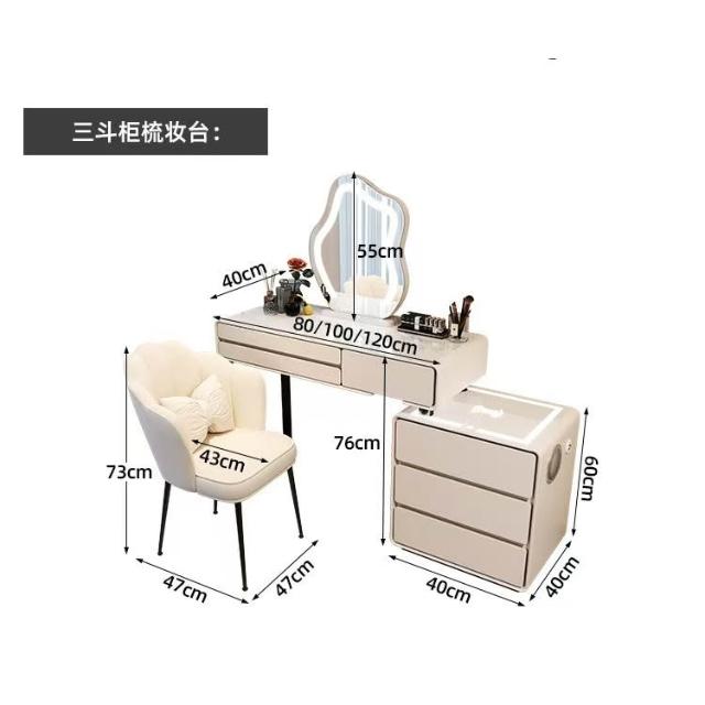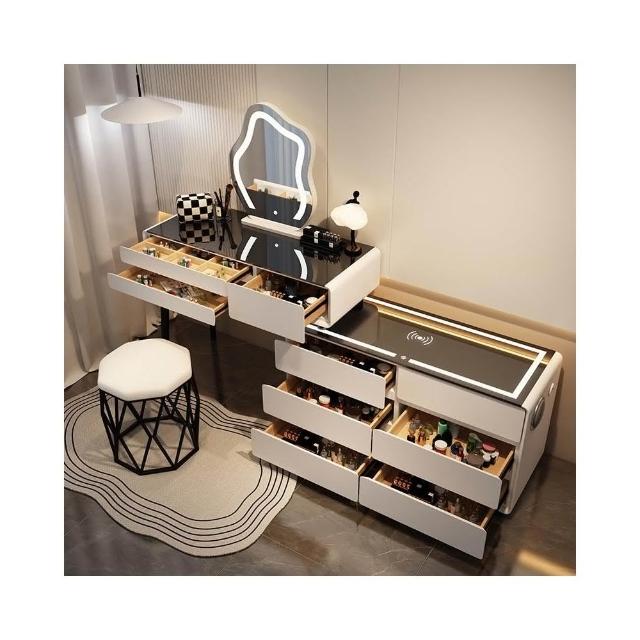 免組裝 可擺L型 梳妝台 奶油風 白色實木岩板 六鬥邊櫃 卧室 化妝臺 收納櫃 轉角斗櫃 伸縮一體 化妝桌 化妝台hna