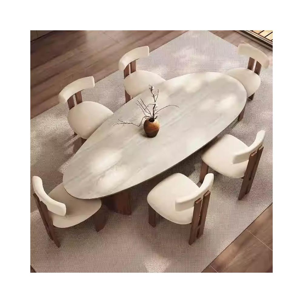 法式中古風米白洞石水滴形岩板餐桌椅黑胡桃色設計師款家用餐桌椅
