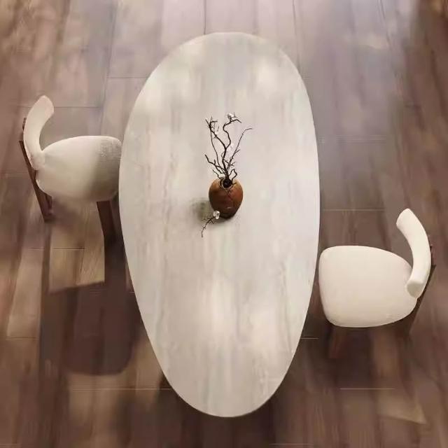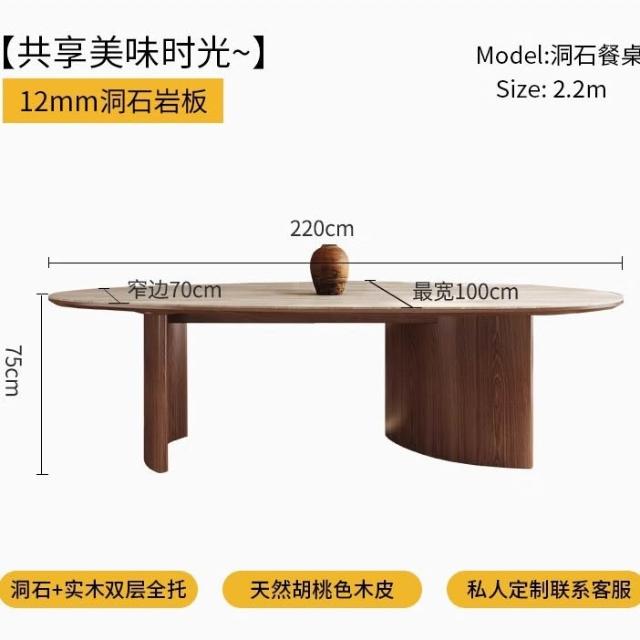 法式中古風米白洞石水滴形岩板餐桌椅黑胡桃色設計師款家用餐桌椅