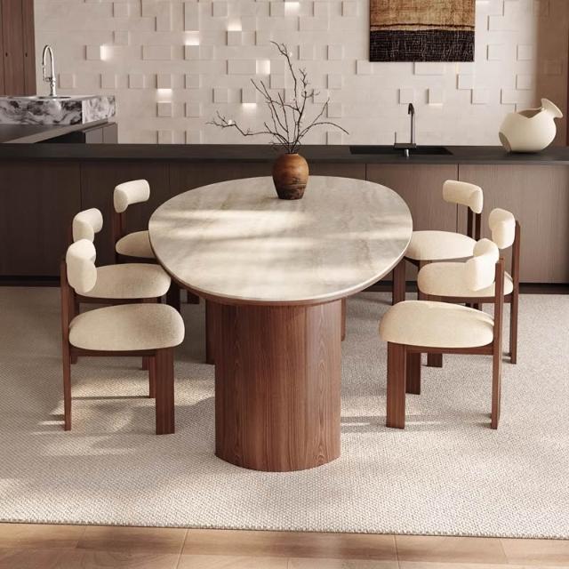 法式中古風米白洞石水滴形岩板餐桌椅黑胡桃色設計師款家用餐桌椅
