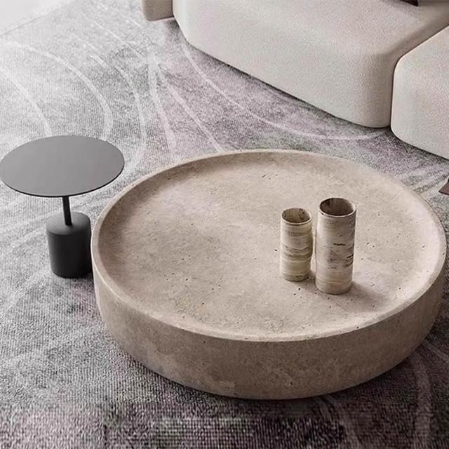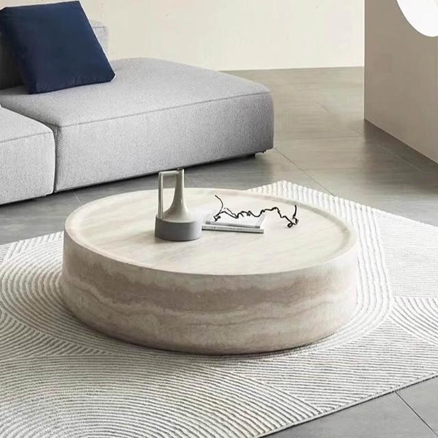侘寂風圓形洞石茶几現代客廳家用咖啡桌簡約設計師創意大理石矮幾