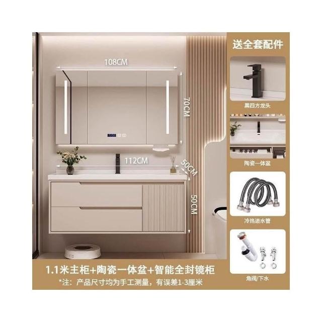 幕辭家居 奶油風實木家用浴室櫃陶瓷一體盆衛生間洗臉盆智能鏡櫃組合洗漱臺 5fd
