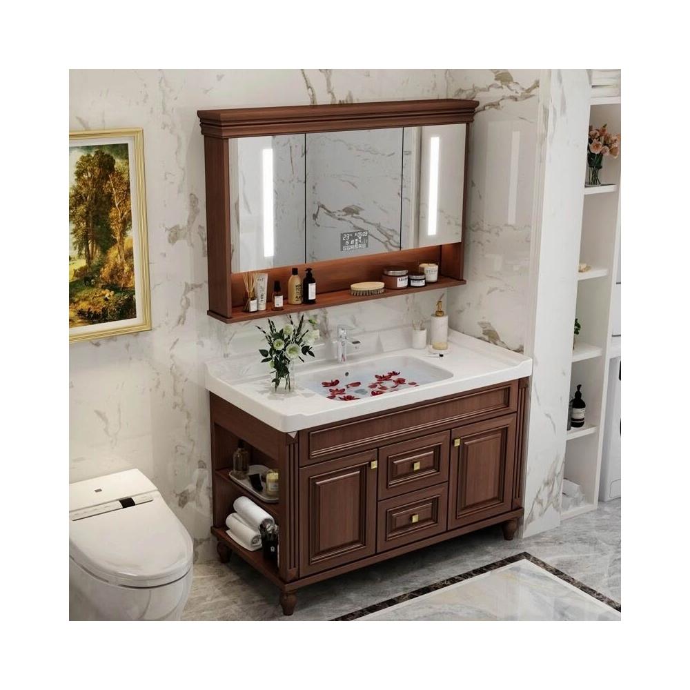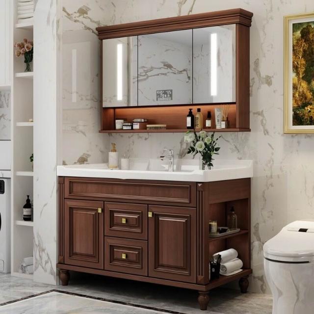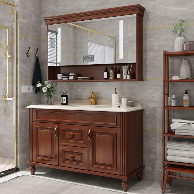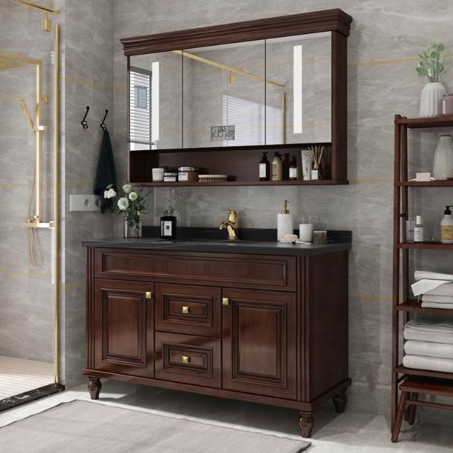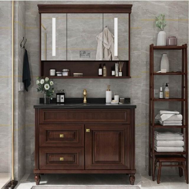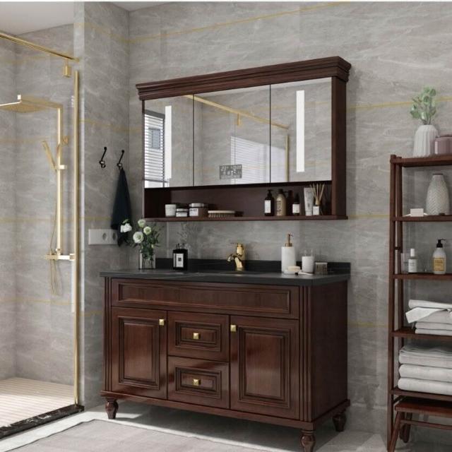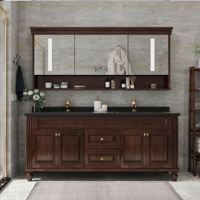 幕辭家居 智能鏡櫃一體陶瓷盆美式浴室櫃新中式實木衛浴櫃巖板一體洗臉盆櫃 0e7