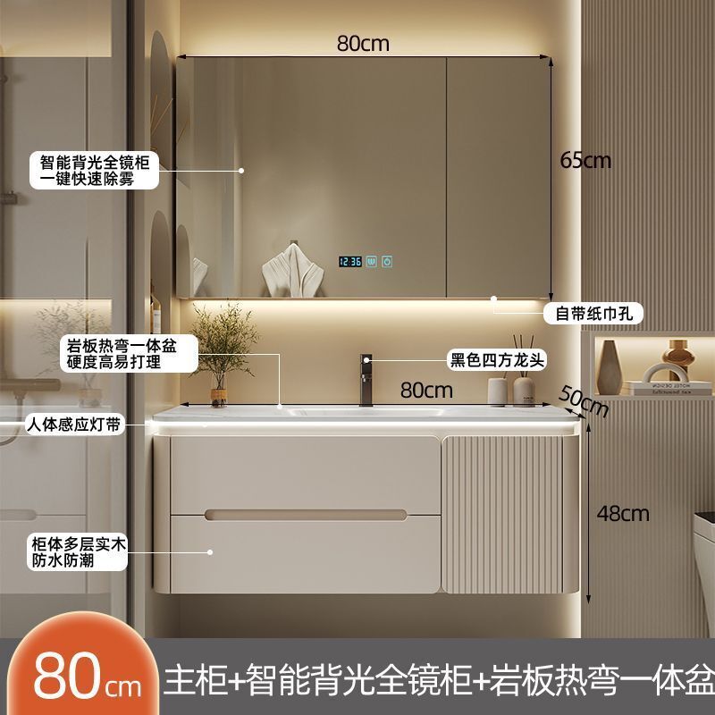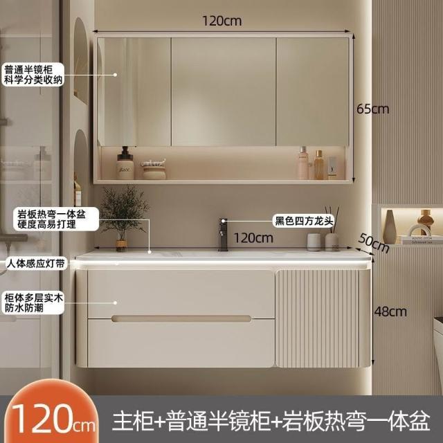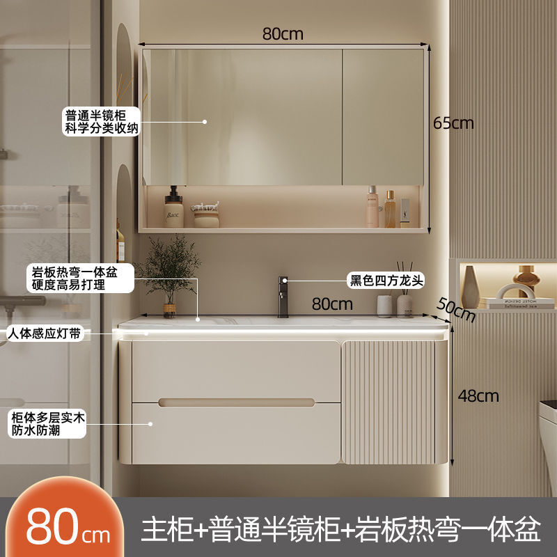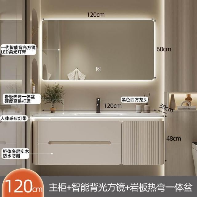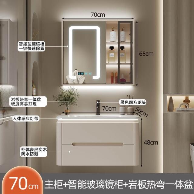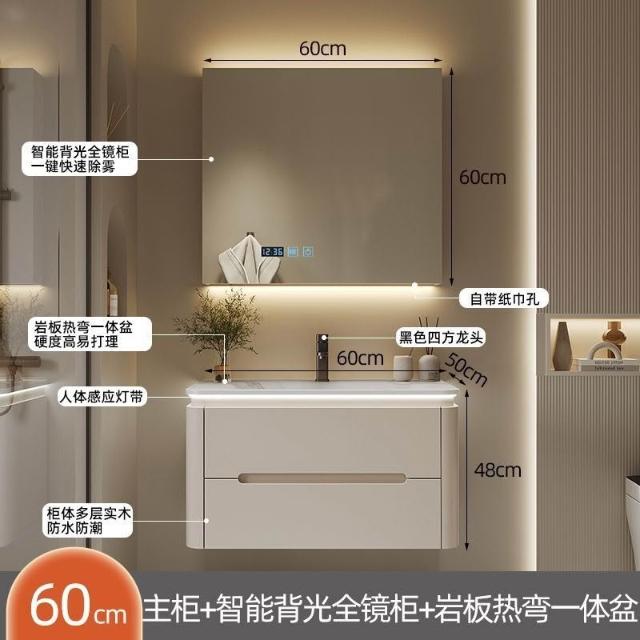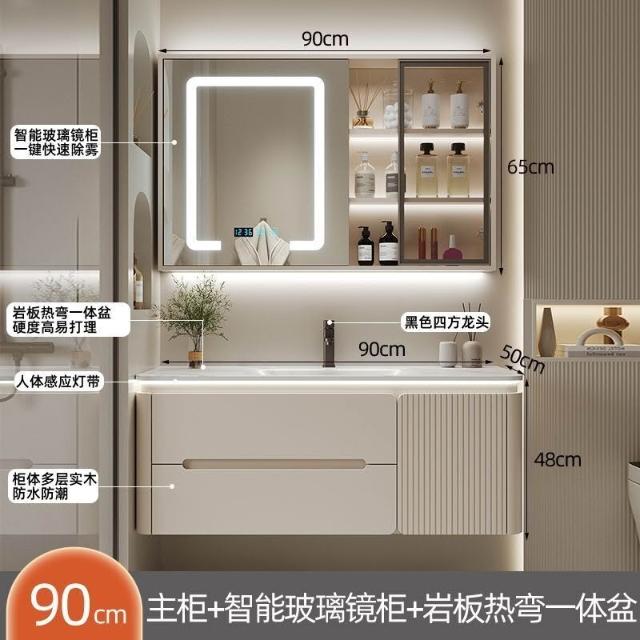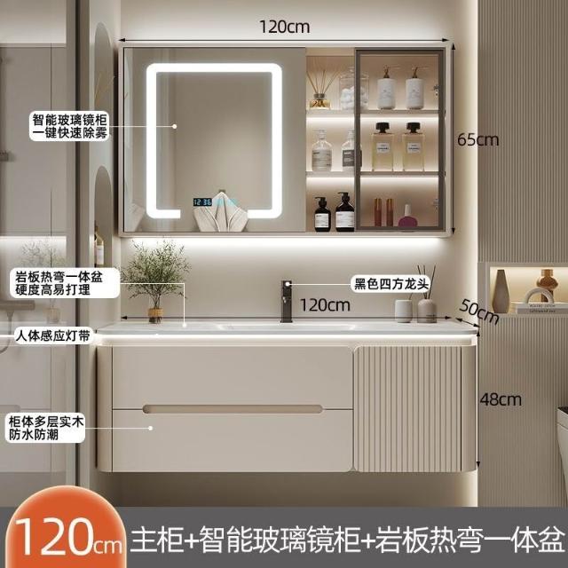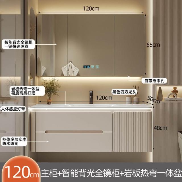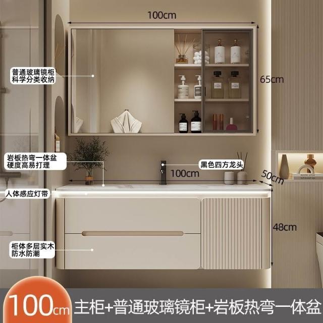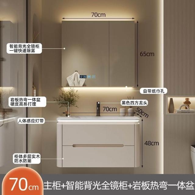 幕辭家居 圓角巖板熱彎一體衛生間奶油浴室櫃洗手洗手盆洗臉盆洗漱鏡櫃組合 fbd